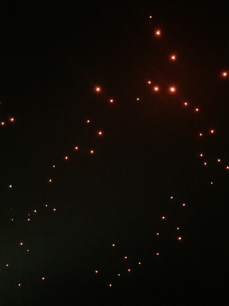 *  (Dans ma chambre, mon plafond bleu nuit a de minuscules trous laissant briller mille fibres optiques en une reproduction « vraie » d’une partie du ciel…travail fait avec passion il y a une vingtaine d’années)