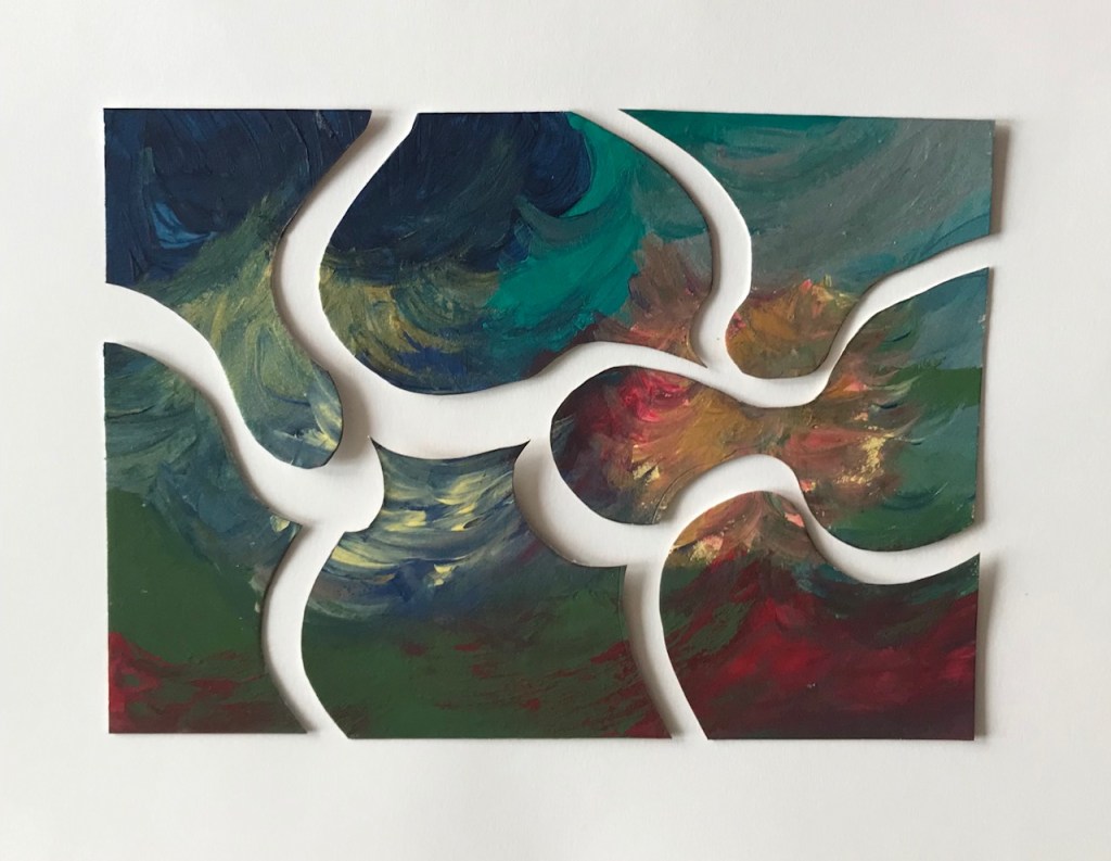 Je sais que mes couleurs ne sont jamais très loin et qu’elles ne vont pas fondre comme neige au soleil, je sais aussi qu’elles me font fondre de tendresse et qu’elles ne me feront jamais fondre en larmes. Elles pourront tel un plumeau de plumes d’oiseaux rares faire voler les poussières noires passées. Elles peuvent aussi quelquefois me transmettre leur énergie . Elles peuvent, si je sais laisser des passages entre elles, donner libre cours à ma joie de vivre et laisser une libre circulation à mes émotions. C’est ainsi que naissent mes tableaux est que j’ai fait avec celui d’hier sans trop savoir pourquoi et par hasard, de cette vie en couleur, une œuvre en 7 morceaux qui me laisse croire qu’elle n’est que puzzle à construire.