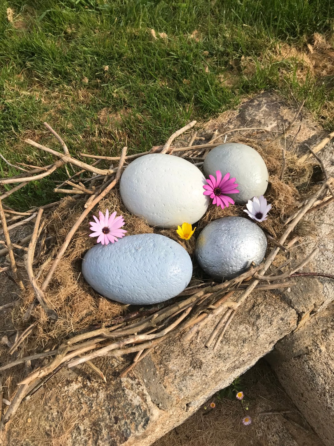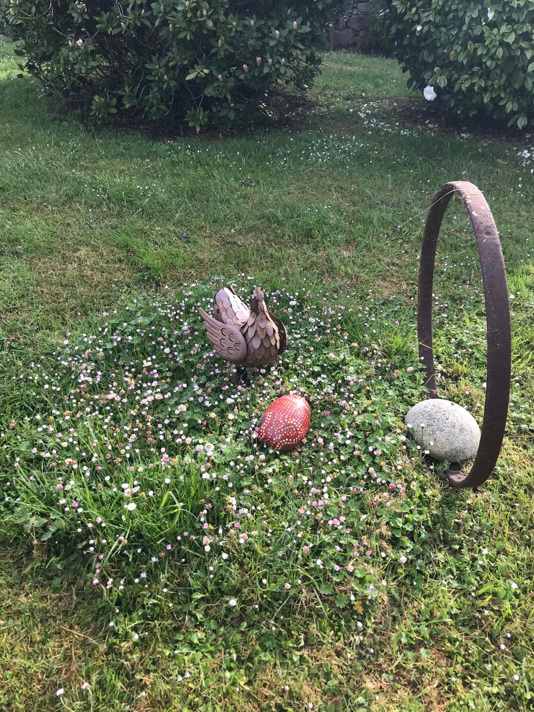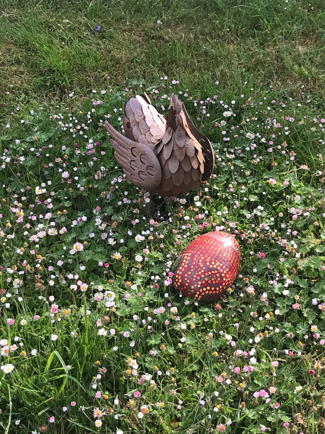 Quelle belle poulette..Magnifique lendemain de Pâques et il reste encore des oeufs dans les pâquerettes chez nous..Les oeufs sont moins gros car les coquetiers sont petits. Belle semaine toute résonnante du son des cloches de Pâques.Bises
