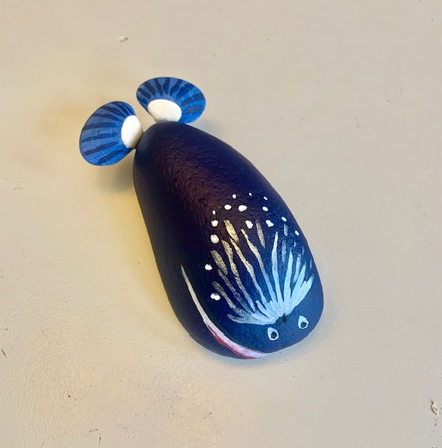 un caillou qui m’a fait de l’œil avec son grand trait souriant , ces deux p’tits trous … j’ai aussitôt vu la baleine et yapluka est arrivé avec ses couleurs ses pinceaux ses coquillages sa colle … le chant des baleine en fond sonore