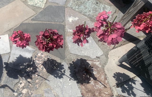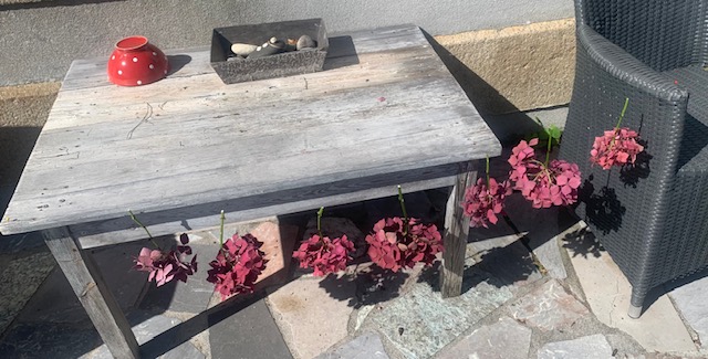 je me prends pour une alchimiste non pas à la recherche de la Pierre philosophale, le Grand œuvre, mais à la recherche et à la conservation de cette belle couleur automnale offerte par mes hortensias 🙂