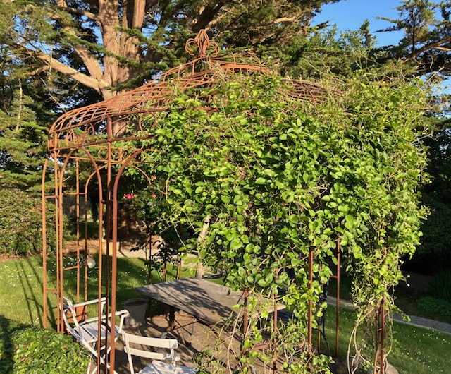Un abri de verdure où passe le soleil et ses couleurs du soir ouvrant la porte aux rêves et aux parfums du jardin !